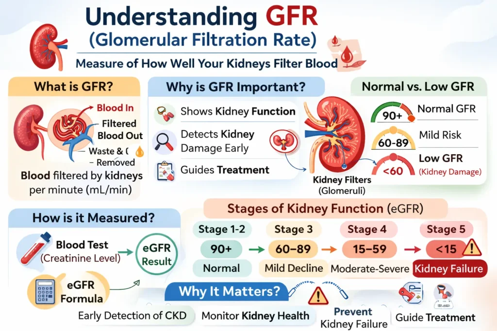 If you are wondering “What is GFR?”, you are already doing the right thing to safeguard your kidney function. GFR is an abbreviation for Glomerular Filtration Rate, which is an essential value that reveals how effectively your kidneys are working to remove waste products, toxins, and fluid from your blood.